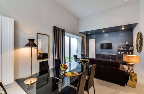 The Brune III is an urban three-bedroom Sweett apartment that reflects perfectly the modern diversity of its neighbourhood here in the XIV arrondissement. Our local interior designer has fashioned an old-world Parisian retreat in a two-floor, three-bedroom townhouse. The decor features gleaming glass, dark leather, and golden accents exuding sophistication. Relax in style on the cosy couch and armchairs while a sweeping curved staircase leads to the bedroom loft. Two additional bedrooms are on the first floor, and the fully equipped kitchen is perfect for gourmet cooking. Enjoy al fresco dining on the private outdoor terrace.