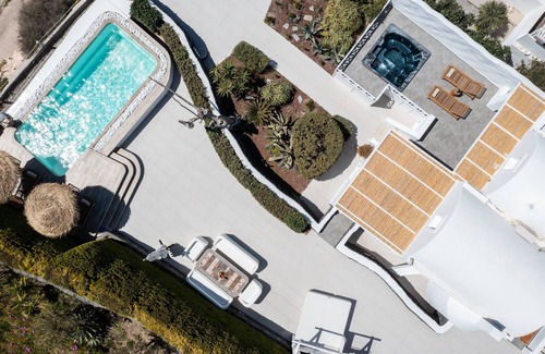 Outside there are a private yard (300 m²) and a balcony, overlooking the Aegean Sea and the most famous sunset, with a BBQ dining area for 8 persons, to enjoy alfresco dining. Also, there is a private outdoor heated hydro massage spa (for 8 persons) and a private swimming pool, which combined with the perfect sea view, will keep you there the whole day. The luxury combined with the ultimate privacy offers an unforgettable stay and a unique experience.