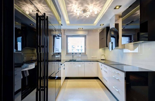 Modern induction cooktop, oven, refrigerator with an ice maker, dishwasher, electric kettle, set of pots and pans, plates, cutlery, wine glasses, mugs, glasses, spacious worktop, numerous kitchen cabinets, LED lighting.