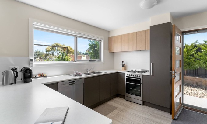 The large kitchen with stainless steel appliances including dishwasher, gas cooktop, electric oven microwave and large fridge can cater for a full family dinner after a hard day skiing or mountain biking. The bathroom has gas hot water, full laundry facilities and plenty of space outside to leave the boards and bikes. The courtyard at the entrance of the property has a locally made picnic table and the hooded gas BBQ is ready to fire up.