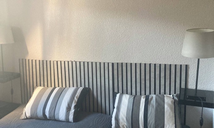 The kitchenette is equipped with an oven, a stovetop, and a refrigerator, as well as a coffee maker, an electric kettle, and a microwave. And there's access to laundry facilities, so you can even pack a bit lighter. Other amenities include bed sheets, an ironing board, and a dining table.