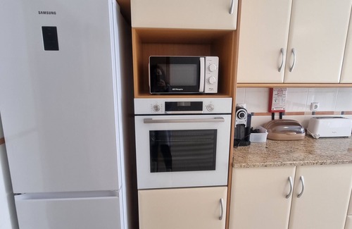 the kitchen, refrigerator, microwave, oven, freezer, dishes/cutlery, kitchen utensils, coffee machine and toaster are provided.