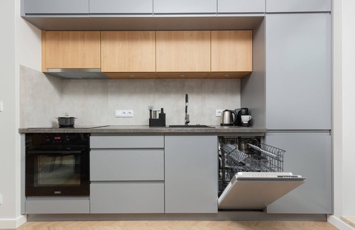 The fully equipped apartment can comfortably accommodate up to 4 people. The room layout consists of a living room with double sofa bed, a kitchenette, a bedroom with a double bed, and a bathroom with a walk-in shower cabin. The rooms also have access to a private corner balcony overlooking the inner courtyard of the estate. With panoramic balcony windows on all sides of the apartment, the interior can be full of natural, sunny light. The apartment is air-conditioned. The finish of the apartment is modern and stylish, with tasteful new furniture providing both functionality and elegance. The modern vibe is enhanced by a wide range of amenities, such as full kitchen and bathroom facilities (a washing machine, a dishwasher, a coffee maker) and multimedia (a flat-screen TV and free access to a Wi-Fi network). The TV has access to 136 cable channels, allowing international guests to watch CNN, BBC, SkyNews, Deutsche Welle, France24, Ukraina24, among others. Guests travelling by car can park for free on a private spot in the underground parking lot. For an easy beginning of every stay, complimentary cosmetics set, towels, and bed linen are provided.
