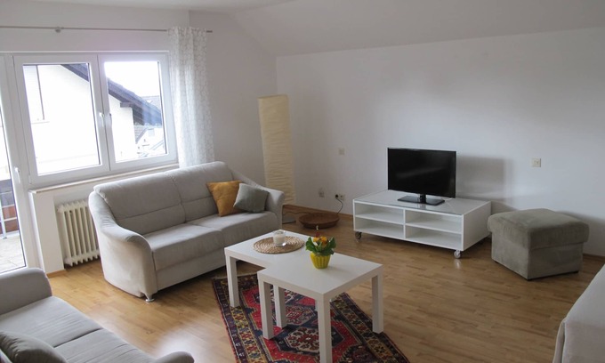 The apartment has 70 square meters and a balcony overlooking the Rhine Valley.