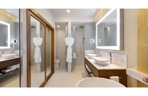 At the 5-Star Villa La Valencia resort hotel, you’ll enjoy first class comforts in your room, a balcony overlooking the pool or ocean, a super "lazy river", sandy beach, spa and fitness, and great restaurant options. As an option you can add "all inclusive" directly with the resort after booking. This room has 2 queen beds, walk-in shower, tub, towels and soaps.