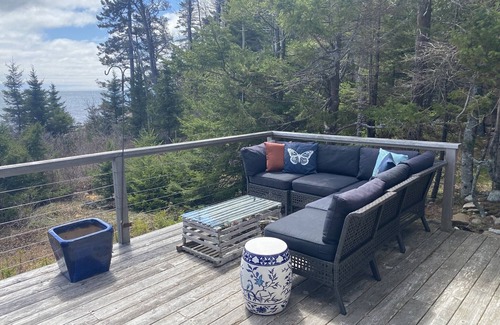 Take in the breathtaking views at our popular oceanside cottage with large deck. | House in Gouldsboro