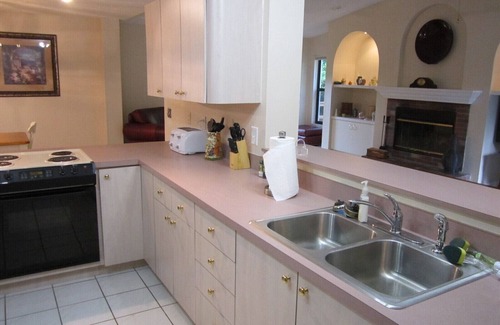 The spacious kitchen has a chopping block island and great spot lights so you can act like you are a gourmet chef, complete with a wine rack (bring wine!) and cork screw......while the family plays a board game on the kitchen table, or at the dining room table which accommodates six....