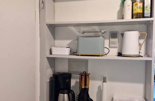 The kitchen is equipped with a stovetop, a refrigerator, and a dishwasher, as well as a coffee maker, an electric kettle, and a microwave. Bathroom amenities include a hair dryer, toilet paper, and soap. Other amenities include a living room, heating, and a dining table.