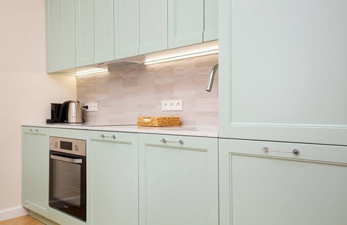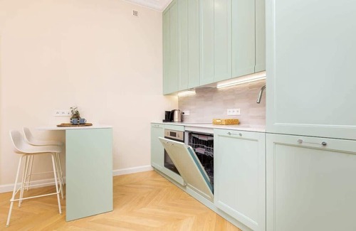 The fully equipped 47 square meter apartment will be perfect for families - it can accommodate up to 4 people! The apartment consists of a living room with a kitchenette, two bedrooms and a bathroom with a shower. The apartment is modern and with a homely atmosphere, with light pink walls and a kitchen with mint-colored fronts. The apartment offers free space and functionality. Additionally, you can relax on the balcony overlooking Warsaw. The apartment has a TV and free WiFi access.