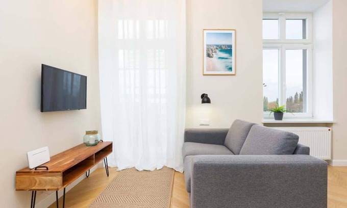 The apartment is part of a tenement house revitalized in 2019. The location is perfectly connected, especially with regard to service premises and public transport. From the nearby train station (200 m) you can get directly to the Old Town, which can be reached in 15 minutes or by walking (2.5 kilometers)