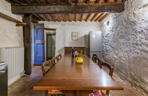Large, rustic on a vinyard country house "Fattoria l'Ottavo", 400 m a.s.l from the 18th century, renovated, surrounded by meadows and vineyards. 3 houses in the residence. 9 apartments in the residence. In the district of Lucolena in Chianti 12 km from the centre of Greve in Chianti, 13 m from the centre of Figline Valdarno, in a secluded, sunny, elevated position, in the countryside. For shared use: property 40 ha, natural garden, meadow, swimming pool fenced (8 x 4 m, seasonal availability: 01.May. - 15.Oct. pool opening hours: 08:00-20:00). Outdoor shower, terrace, garden furniture, barbecue, pool maintenance by the owner/gardener. In the house: reception, restaurant, breakfast room, WiFi, washing machine (for shared use). Linen change weekly. Breakfast possible on request (extra). 200 m long narrow motor access to the grounds. Parking on the premises. Shop 700 m, grocery 700 m, supermarket 12 km, shopping centre 13 km, restaurant 1 km, bar 700 m, bakery 700 m, bicycle rental 12 km, bus stop "Lucolena" 700 m, railway station "Figline Valdarno" 13 km, sandy beach "Calambrone" 110 km, indoor swimming pool 13 km, lake Trasimeno 114 km. Golf course (18 hole) 20 km, tennis 12 km, riding stable 2 km, walking paths from the house 100 m. Nearby attractions: Firenze 37 km, Siena 50 km, Arezzo 54 km, San Gimignano 65 km. Please note: car recommended. Reception open 10:00-17:00 hrs. Suitable for families, baby equipment (included). Suitable for events. Local sale of farm products. Please note: the owner lives on the same property. All houses/apartments are individually designed/furnished.