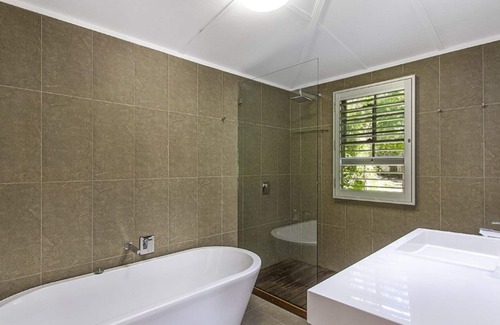 * Modern bathroom with bath, shower and toilet. Full internal laundry
