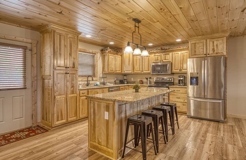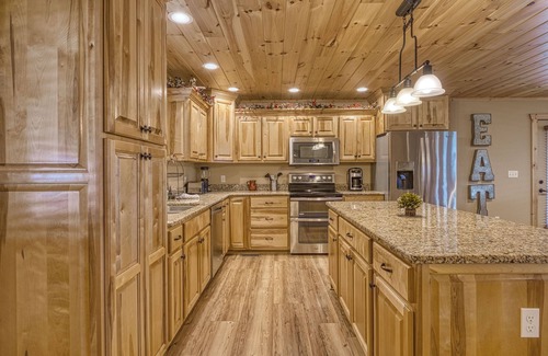 Your choices go on and on. The game room has a pool table and Multi-cade game console with over 40 games. The media room has twelve comfy recliners with cup holders so that everyone can enjoy the surround-sound from the 75” HD TV with DVD player. The downstairs kitchen allows for easy snack prep for everyone watching movies or enjoying the hot tub. There’s a gas grill on the upper deck just outside the kitchen for more cooking options. You’ll appreciate the craftsmanship and attention to detail in all of the furniture, fixtures, and appointments, but everything is intended for comfortable, real-life enjoyment.