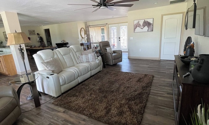 TEE IT UP for a Great Time at this Golf Course home in Amazing Sun City, Arizona's 55+ Active Adult Fun City. Enjoy the Golf Course views of trees, ponds and wildlife Perfectly located within miles of fine dining and P83 Entertainment District Complete your day enjoying the big screen TV before retiring to the tremendous king bed or the cool queen bed for a restful night's sleep. Make your Get A Way one for the books with a stay at our place.