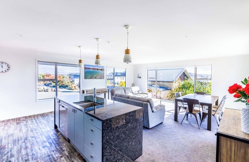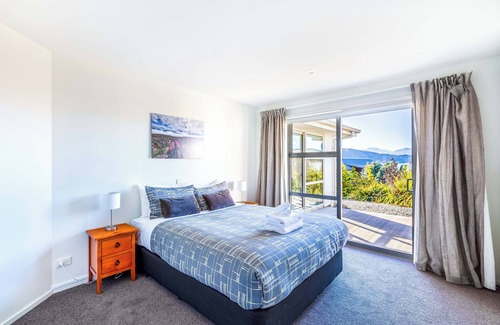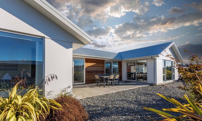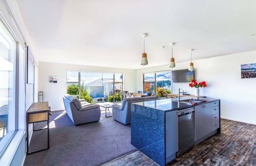 Tekapo Blue House is a four-bedroom home featuring open living spaces with lake views. Tekapo is renowned for viewing the night sky, visiting the Church of the Good Shepherd, and taking in the stunning color of the lake. When staying in Tekapo Blue you are close to all of these sights, as well as being situated in a quiet neighborhood.