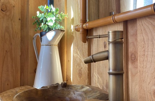 Nearby, your private bathroom, with a magnificent hand-crafted olive wood basin, shower and toilet.