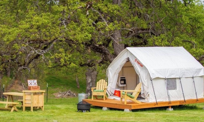 Your Tentrr campsite includes a 10'x12' (120 square feet) safari-style canvas tent on a raised wooden platform. Inside the tent you'll find one queen bed or a queen-size bunk bed (see photos for the exact setup). The tent is big enough for the bed plus one or two extra sleeping bags on the floor. Aside from the canvas tent, campers can also use the extra 5-person pop-up dome tent that’s provided. You'll also have a 6-ft picnic table, outdoor fire pit, 2 Tentrr Adirondack chairs, and a heating source to keep you warm and toasty at night.