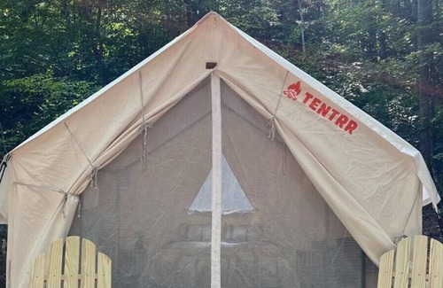 Your Tentrr campsite includes a 10'x12' (120 square feet) safari-style canvas tent on a raised wooden platform. Inside the tent, you'll find one queen bed with a memory foam mattress. The tent is big enough for the bed plus one or two extra sleeping bags on the floor. Aside from the canvas tent, campers can also use the extra 5-person pop-up dome tent that's provided. You'll also have a 6-ft picnic table, outdoor fire pit, 2 Tentrr Adirondack chairs, and a propane heater in the tent to keep you warm at night.