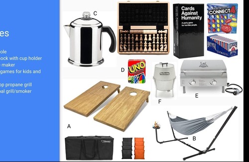 - Charcoal/propane if desired (both available as add-ons $$)