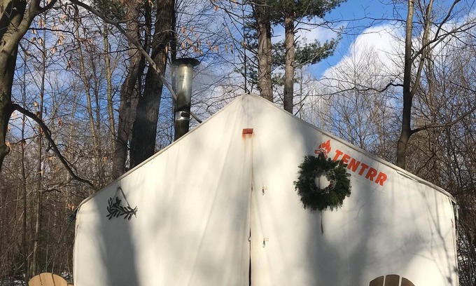 Your Tentrr campsite includes a 10'x12' (120 square feet) safari-style canvas tent on a raised wooden platform. Inside the tent you'll find one queen bed or a queen-size bunk bed (see photos for the exact setup). The tent is big enough for the bed plus one or two extra sleeping bags on the floor. Aside from the canvas tent, campers can also use the extra 5-person pop-up dome tent that’s provided. You'll also have a 6-ft picnic table, outdoor fire pit, 2 Tentrr Adirondack chairs, and a heating source to keep you warm and toasty at night.