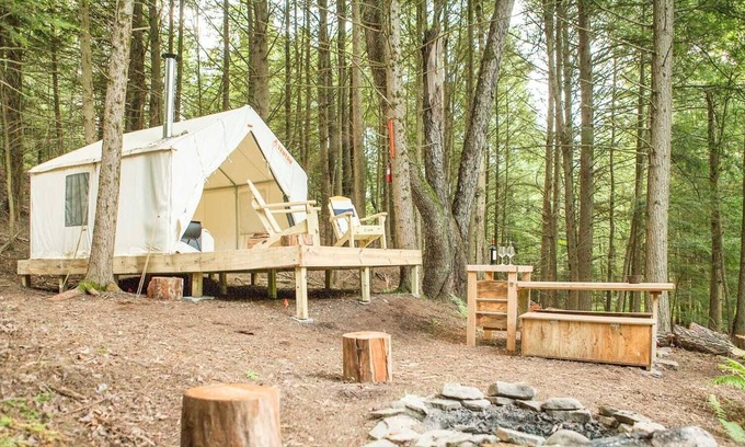 Your Tentrr campsite includes a 10'x12' (120 square feet) safari-style canvas tent on a raised wooden platform. Inside the tent you'll find one queen bed or a queen-size bunk bed (see photos for the exact setup). The tent is big enough for the bed plus one or two extra sleeping bags on the floor. Aside from the canvas tent, campers can also use the extra 5-person pop-up dome tent that’s provided. You'll also have a 6-ft picnic table, outdoor fire pit, 2 Tentrr Adirondack chairs, and a heating source to keep you warm and toasty at night.