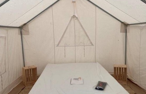 Your Tentrr campsite includes a 10'x12' (120 square feet) safari-style canvas tent on a raised wooden platform. Inside the tent you'll find one queen bed with a memory foam mattress. The tent is big enough for the bed plus one or two extra sleeping bags on the floor. Aside from the canvas tent, campers can also use the extra 5-person pop-up dome tent that’s provided. You'll also have a 6-ft picnic table, outdoor fire pit, and 2 Tentrr Adirondack chairs.