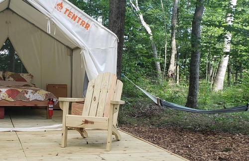 Your Tentrr campsite includes a 10'x12' (120 square feet) safari-style canvas tent on a raised wooden platform. Inside the tent you'll find one queen bed with a memory foam mattress. The tent is big enough for the bed plus one or two extra sleeping bags on the floor. Aside from the canvas tent, campers can also use the extra 5-person pop-up dome tent that’s provided. You'll also have a 6-ft picnic table, outdoor fire pit, and 2 Tentrr Adirondack chairs.