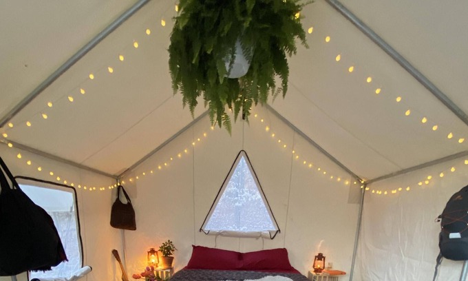 Your Tentrr campsite includes a 10'x12' (120 square feet) safari-style canvas tent on a raised wooden platform. Inside the tent you'll find one queen bed or a queen-size bunk bed (see photos for the exact setup). The tent is big enough for the bed plus one or two extra sleeping bags on the floor. Aside from the canvas tent, campers can also use the extra 5-person pop-up dome tent that’s provided. You'll also have a 6-ft picnic table, outdoor fire pit, 2 Tentrr Adirondack chairs, and a heating source to keep you warm and toasty at night.