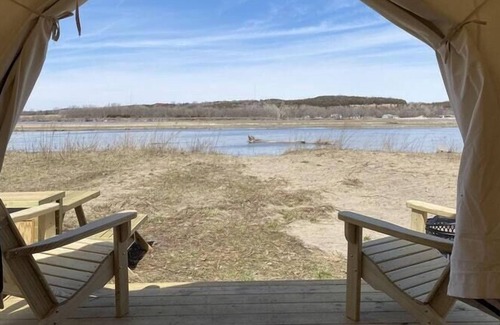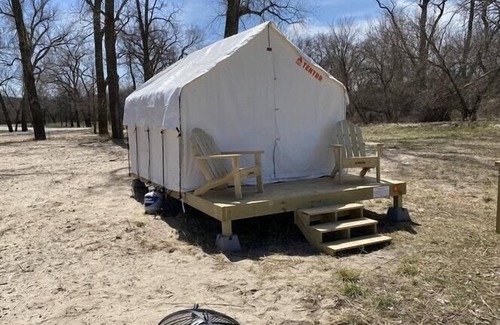 Riverview C is located approximately 1 mile from the park entrance and has a view of the Platte River. Your partially shaded campsite is about a 2-minute hike in from the parking spot. The site features a spacious 10 x 12 platform tent with a queen bed as well as a pop-up tent that can accommodate 4 additional campers. A picnic table, firepit and two Adirondack chairs are also included. There is a Tentrr Loo (camping potty) at your campsite for convenience. Campers will also be able to access modern bathhouses for showers and restrooms at the park but these facilities are some distance from the tent. If you're looking to camp with another couple, family or group consider booking Riverview C and Riverview D.
