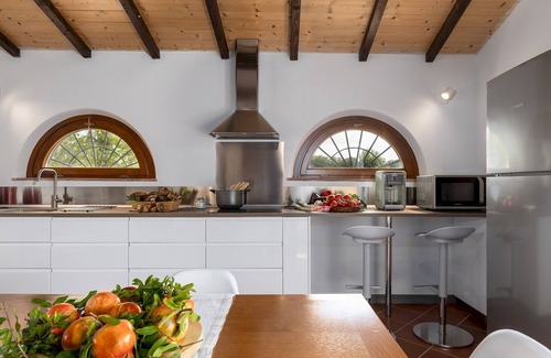 The farmhouse spans two floors. GROUND FLOOR - Main entrance located under the portico leading to a living area with sofas; large kitchen; tv room and dining area connecting to a multi-purpose space; guest bathroom. Adjacent to the external portico is a guest bathroom with washing machine. FIRST FLOOR - Two double bedrooms, one twin bedroom and two bathrooms with shower. Also on the first floor with access via a wooden spiral staircase, there is the suite with double bedroom and en-suite bathroom with shower. Air conditioning in the bedrooms and living room.