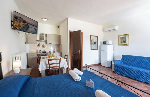 The studio apartment is on the ground floor and looks out over Tenuta Ricco’s lovely swimming pool. It is elegantly furnished with a wrought-iron double bed and a sofa, which converts into another double bed. The studio also has a table for 4, a flat-screen TV and a wardrobe for storage. In the corner, guests will find a fitted kitchenette. This is well-equipped with an induction hob, oven, microwave, Moka coffee maker and a fridge/freezer.