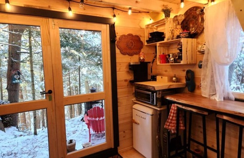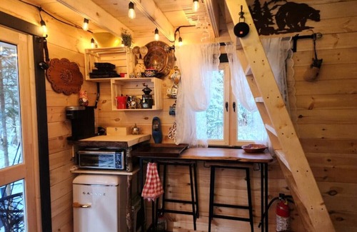 - Tiny Cabin with Character: Teremok, a themed tiny log cabin with a 14 ft cathedral ceiling, crafted from European pine logs, offers a cozy retreat on a cliff surrounded by a peaceful tall pine forest near the Muskoka River.