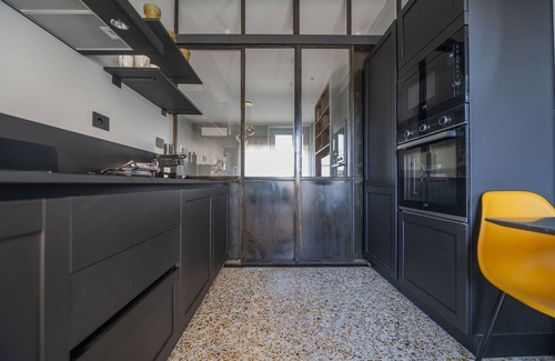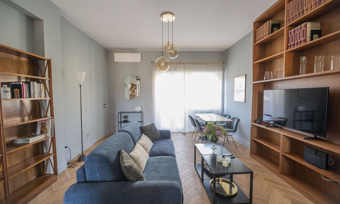 Each bedroom is unique, featuring English wallpaper, vintage details, and carefully chosen colors that enhance comfort and character. The herringbone oak floors contrast beautifully with the vintage marble in the kitchen and the mosaic tiles in the bathrooms. Restored terrazzo tiles and new ones enrich both the kitchen and bathrooms. The custom-designed kitchen opens onto the terrace and living room, maintaining harmony through sliding glass doors.