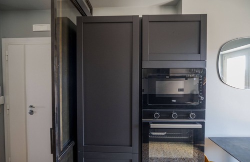 The bathrooms, with their retro-modern style, combine Grandinetti tiles, hand-painted French artwork, and custom iron details. A hidden utility closet houses a washer and dryer. The terraces—rare and privileged spaces—extend the charm of the home outdoors, offering views, tranquility, and a sense of intimate elegance.