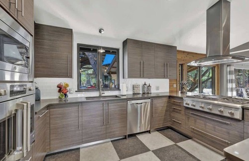 On cooler nights, guests can light a fire or turn on the outdoor heaters to get some warmth and snuggle in. The six-person hot tub is the perfect place to enjoy a sunset and unwind. The additional covered seating area, called the Fish Camp, is perfect for dining al fresco and features a TV and dart boards. The spacious grass area is perfect for a game of cornhole with friends while the kids play in the hammock swing or the play structure.