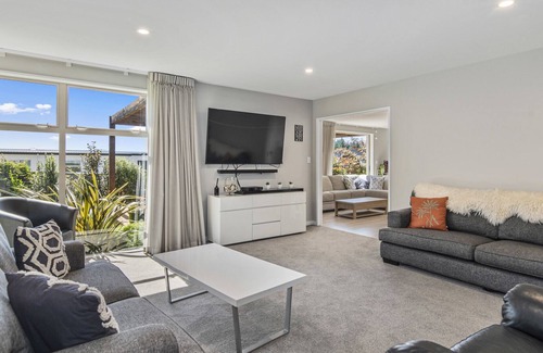 Spacious and accommodating, this Blenheim holiday home is comprised of neutral tones to provide a light and airy living space. The sleek and stylish kitchen boasts modern appliances and a centre-island bench, while the living-dining space is warmed by a wood-burning fireplace.