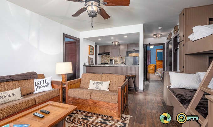 This fully-renovated condo has a huge wood-burning stone fireplace. The living area has a view of Great North Mountain and dining is at the kitchen bar/counter. The huge bedroom has two queen beds, and additional sleeping capacity is located in a separate room (two twin beds) as well as custom bunk beds in living room area (huge hit with kiddos!) This unit comfortably sleeps up to eight, subject to the constraints of a single bathroom. You'll love the short walk to the ski/bike lift and Bryce Resort's facilities. The living room and bedroom feature smart TVs (streaming only). The bathroom features separate powder and shower/commode rooms, plus washer/dryer combo unit.