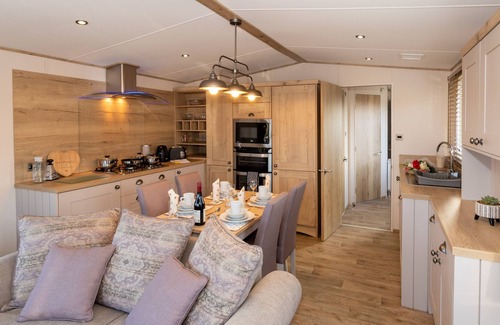 The open plan living / dining / kitchen area with patio doors opening out to the large deck, offers the perfect place to relax during your break.