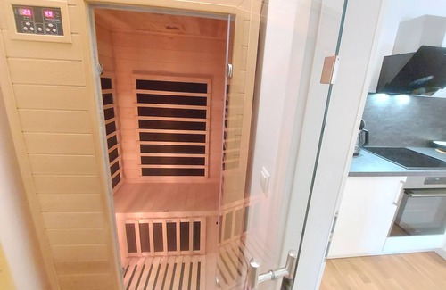 The storage room next to the kitchen is equipped with an infrared cabin for 2 people. On the balcony you can enjoy the winter and summer sun on the balcony furniture. A carport offers good protection for your vehicle against snow and bad weather and your bicycles can be stored in a lockable storage room next to the carport.
