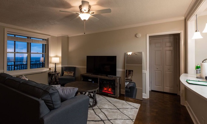 The unit features a very comfortable sealy plush top queen bed in the bedroom plus a queen pullout sofa comfortably accommodating 4 guests. A fully operating and stocked kitchen is ready for creating a romantic home cooked meal overlooking the city or just cozy up on the couch, watching TV by the fireplace.