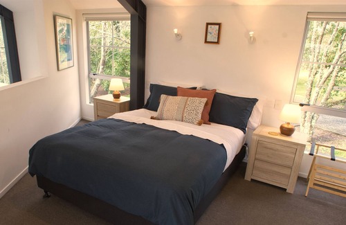Recently renovated fully furnished modern house on a beautiful big property. Open plan living, dining and kitchen area with private outside deck overlooking Mahurangi Inlet. Main bedroom with Queen bed on the mezzanine floor. The second bedroom contains 2 single beds. Access to both bedrooms is up stairs.