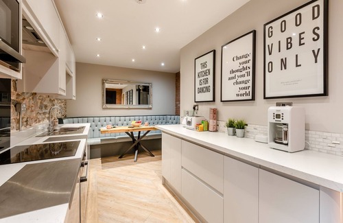 Move into the large living space with original stone and brick walls, complimented sympathetically with additional Cumbrian brick walls and Cumbrian sandstone headers. The large seating area faces the feature Cumbrian stone fireplace and 75" TV above, perfect for those movie nights in with popcorn and nibbles. Located just off the living area is a walk-through cloakroom leading to the generously sized downstairs toilet, both also featuring original stone walls. Continuing through the ground floor is the fully equipped kitchen and dining area, featuring another large 65" TV and American-style diner seating, making it perfect for mealtimes and as an additional seating area to make the most of this spacious accommodation.