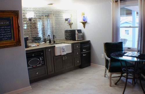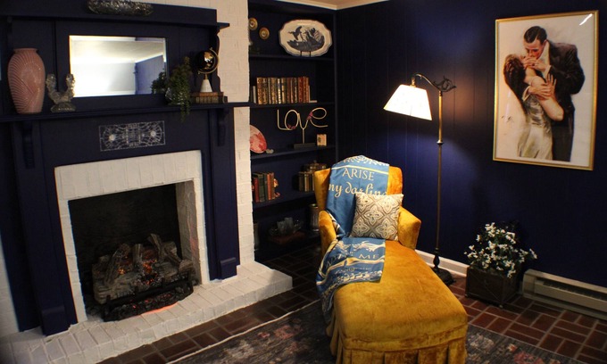 Reconnect in a boutique pied-a-terre nestled on Main Street in the heart of Abingdon’s Historic District with classic Art Deco Design. The Green Room was inspired by The Barter Theater. Your ground-level suite includes a well-equipped kitchenette/dining with sofa/trundle; walk-in shower with body spray & rain head; smart TV, antique electric fireplace with bar & phonograph, internet; bedroom with queen bed, beautiful fireplace, chaise lounge and glamorous dressing table.