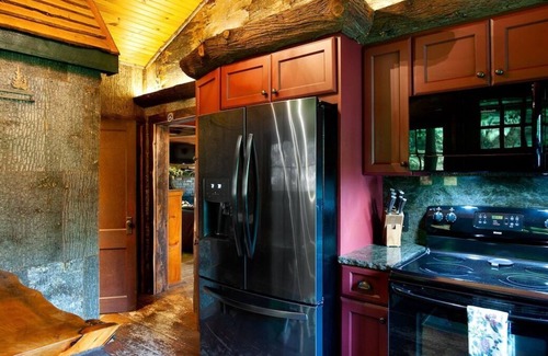 The backyard of the cabin offers a rustic firepit surrounded by Adirondack chairs, a Propane Grill, and room for your pet or children to roam.