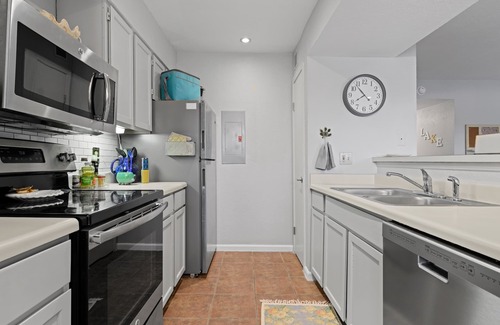 This newly remodeled condo is one of a kind with a family friendly vibe perfect for lake living. The two bedroom, two bath condo with a sleeper sofa has tile flooring throughout and is located on the 2nd floor (no elevator) with the best sunset views on the lake. It has a spacious master bedroom with a King bed and plenty of room for a pack-n-play, if you have an infant (pack-n-play stored in closet of second bedroom for your convenience). The second bedroom is equally spacious with a queen bed with a large closet (The closet is clutter free – our kids played in there for hours when they were younger). The condo has two bathrooms with tub/shower combo and full-size washer/dryer. Premium sheets, bedding and towels are provided for your comfort.
