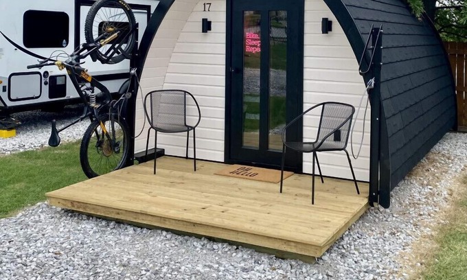 Welcome to The Bike Inn, Bentonville! The Mulberry River Cabin is a stunningly beautiful Handcrafted Cabin with a Queen Bed, Breakfast Bar featuring a microwave, Mini Fridge, and Keurig with everything you need to get your morning going. Please note, you will have access to the Guest Lounge & Shower House for all your washroom needs. The Guest Lounge has a large kitchen & living room area, 2 restrooms, and a shower. Our heated outdoor shower is also highly recommended.