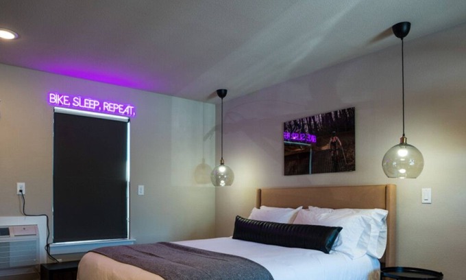 Clean & Comfortable, well-appointed Single Queen Studio. The Bike Inn is a newly renovated Roadside Boutique Motel that offers; In room bike storage, Wash station, Repair station, WIFI, On-site laundry, Fire Pit, Gazebo, Picnic Tables ,BBQ grill ,Camper Van/Small RV parking, Outdoor hot showers for Campers, Access to Guide Services, Access to Skills Coaches, & a community of like-minded adventurers!