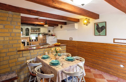 The interiors of this rustic townhouse exude warmth and charm, featuring wooden-beamed ceilings, cosy bedrooms with traditional furnishings, and a spacious living area perfect for relaxation. The fully equipped open kitchen and dining area feature an oven, induction hob, microwave, fridge, coffee machine, electric kettle, toaster, and washing machine. The property is on the ground floor, providing easy access and a welcoming atmosphere.