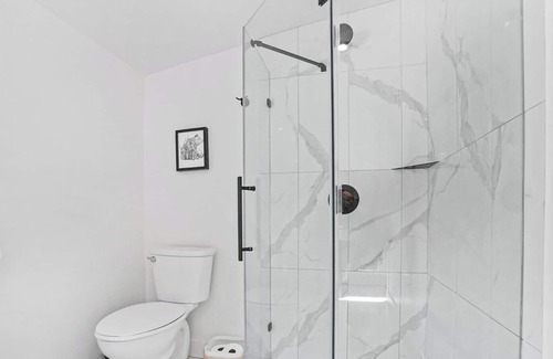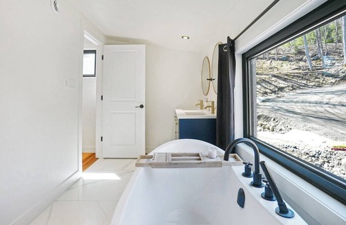 The modern yet rustic space is open concept with towering ceilings and white on black color scheme that adds to the already breathtaking views. Guests have access to the entire 4 acre property complete with trails and 436ft of water frontage. The proper is well forested and quiet. There is a fire pit, canoe and kayak for guest use and we’ll as a sauna by the water and hot tub that is available for an extra charge.