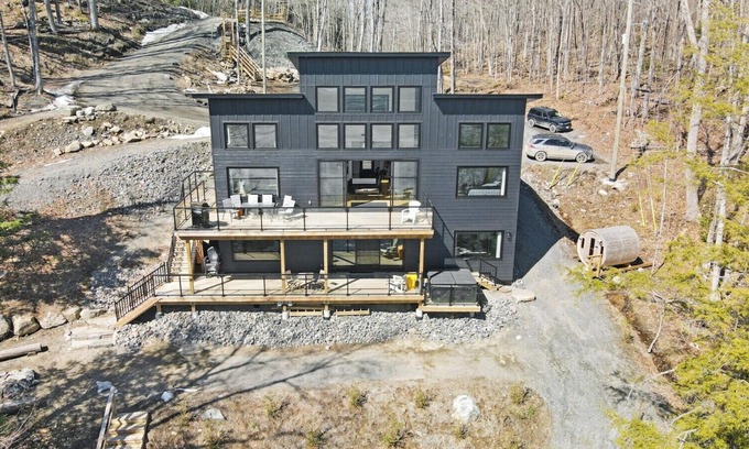 The Blackstone - FAST RELIABLE INTERNET STARLINK WORK FROM HOME at this modern yet rustic cottage is located just 10 minutes from the village of Haliburton on Drag's Lake, lazy bay. Nestled in a forested 4 acre lot it has great privacy and an exceptional 436 ft of waterfront shoreline.